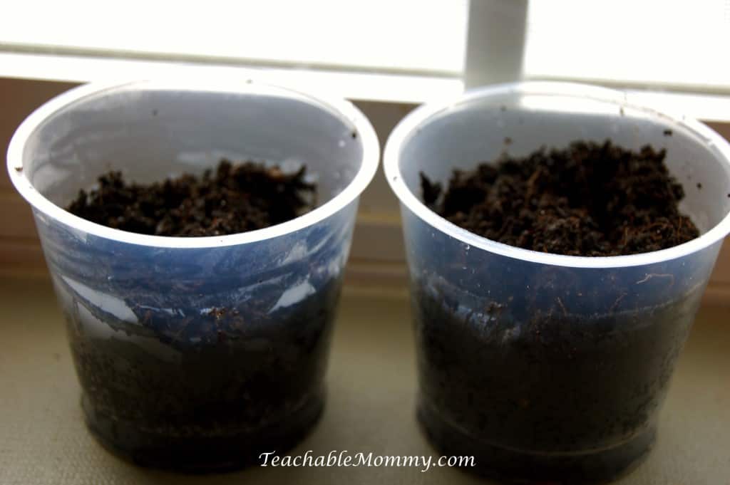 1. Fill the cup almost to the top with soil. Add water making it moist not soggy.