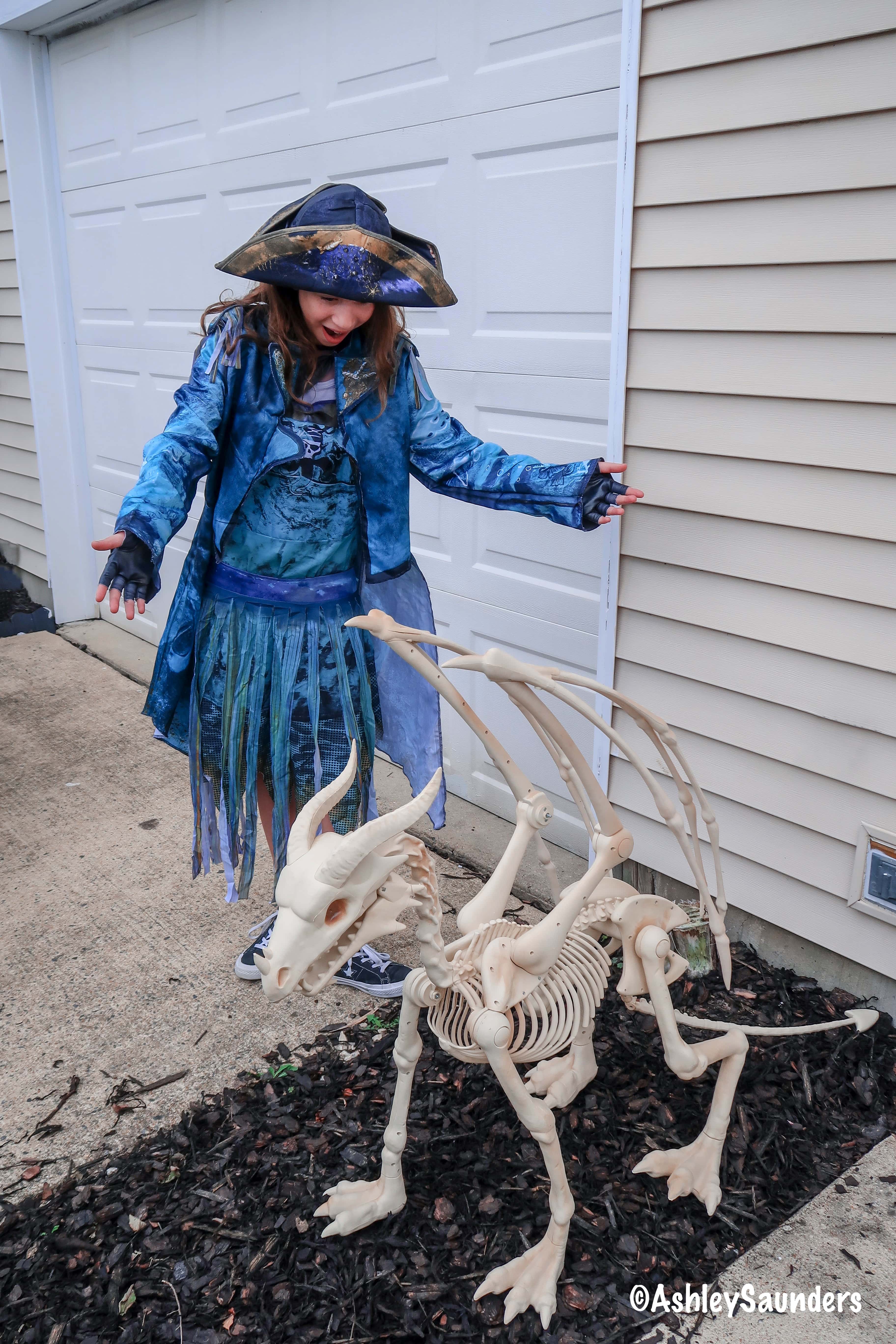 My daughter who so graciously offered to show off all the cool Halloween decorations we picked up asked me to pick out something special for her. Since she already has a Mal Costume we went with Isle of the Lost Uma this year. Now she is ready for trick-or-treating and Pirate Night on the Disney Cruise.