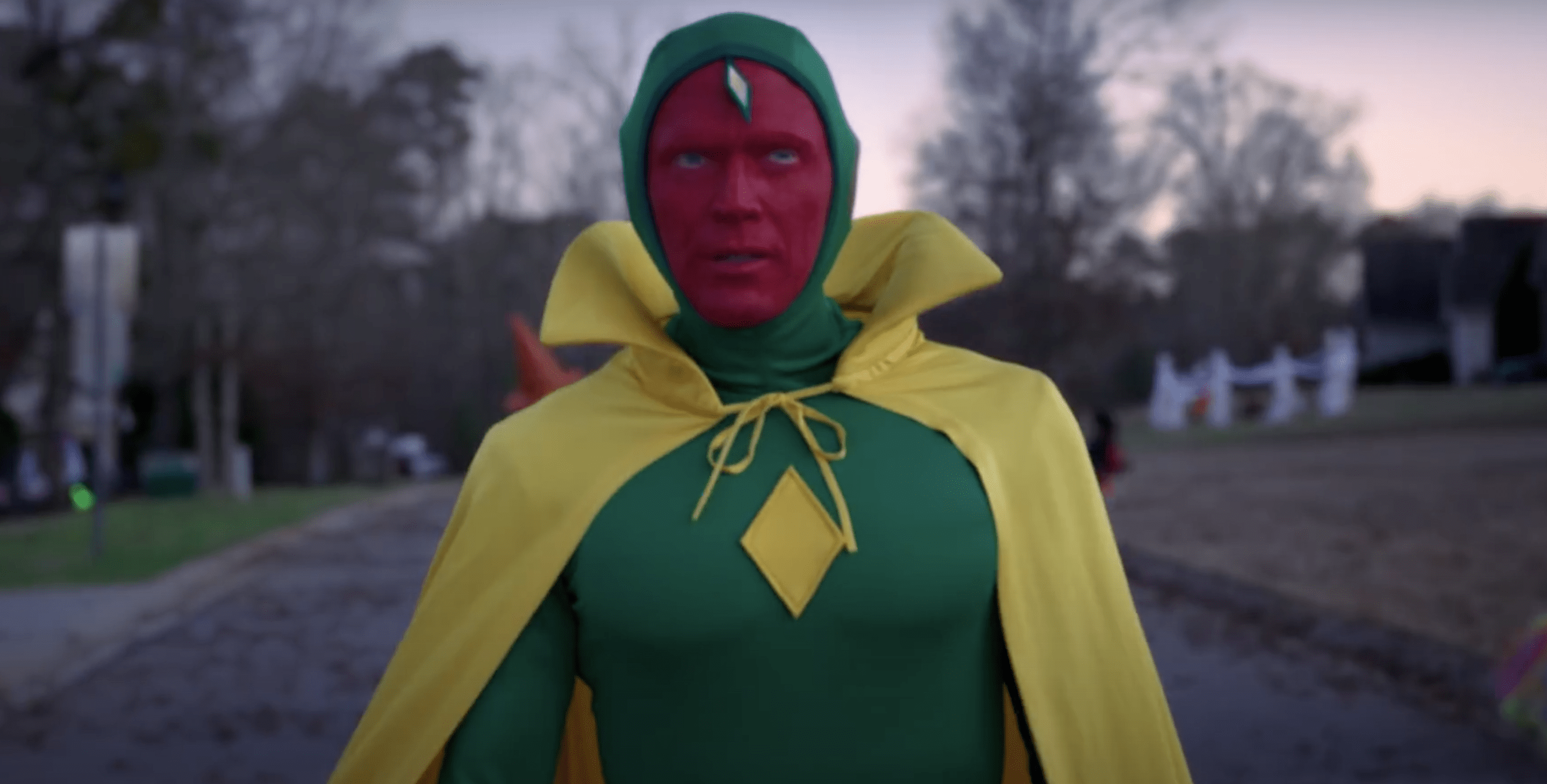 It is Halloween time and Scarlet Witch is showing off her classic comic book look. While Vision takes a flight around the neighborhood, looking concerned.